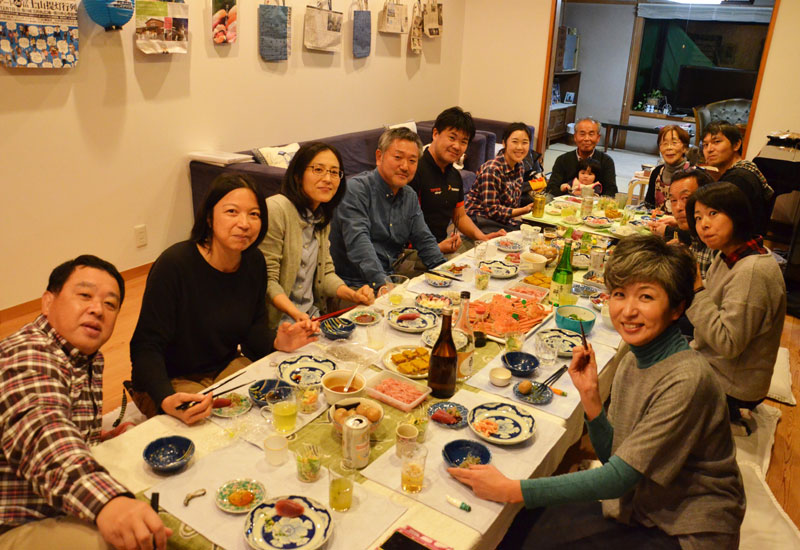 「イモをやるで~!」のひと言に「待ってました!」とばかりにサイクリストや市民活動の仲間たち12人が集まった。場所を提供してくれた井村征司さん(ローカルライフスタイル研究会代表)宅では2時間前から芋汁(自然薯汁)の準備開始。芋汁は男の仕事。代々伝わる大鉢を坐禅するがごとく抱え込み、背丈ほどもある自然薯を粘りが出るまで額に汗して擦り続ける。オタマで掬った自然薯が50センチほど伸びたら、卵、日本酒、そしてサバや椎茸の出汁の効いた各家庭秘伝の味噌汁を大鉢の縁に回すように投入し、さらに擦る。自然薯を傷つけずに掘るのも重労働だけれど、芋汁作りの手間暇も半端じゃない。