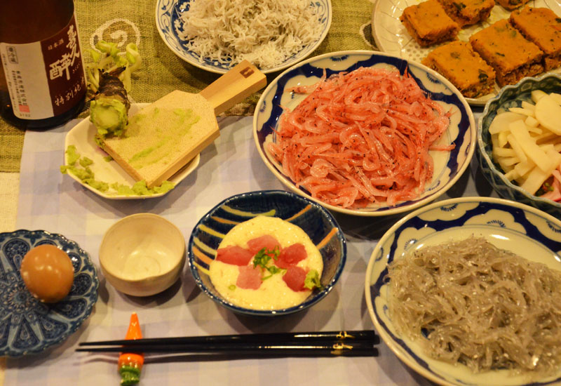 食卓には駿河湾の由比港から「桜えび」と「生シラス」、安倍川上流の山葵発祥の地「有東木(うとうぎ)」の生わさびと駿河湾で獲れた戻りガツオ、そこに互産互消で繋がった京丹後の「間人(たいざ)ガニ」が飛び入り。地域風土の育んだ顔の見える食材を前に井戸端会議ならぬ芋汁会議が弾んだところで、いよいよ麦飯に芋汁をたっぷり掛け、各自がズルズルと何杯もお代わり……これが遠州流「イモ」の流儀。