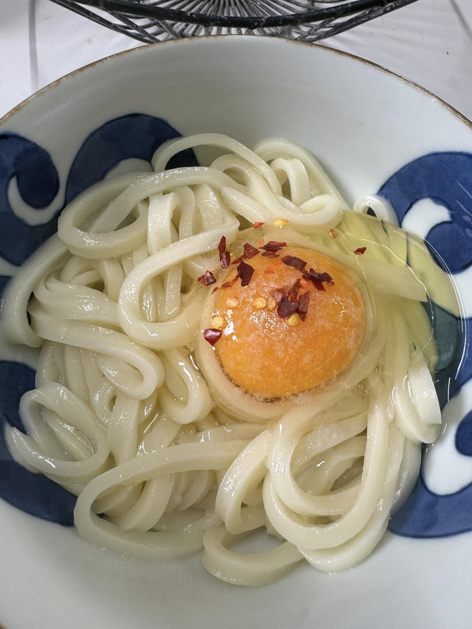 三嶋製麺所、倉庫?みたいな建物の中でうどんを頂く。卵は何個かは自己申告